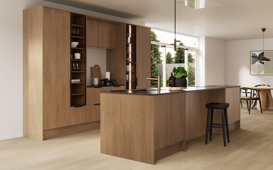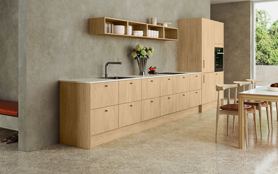 Her får du et køkken, der fungerer – både når der skal laves mad, og når der skal være plads til samvær. Den lyse melaminoverflade i Silva lys eg giver et roligt udtryk og passer godt ind i en nordisk og neutral stil – uden at det bliver klinisk.